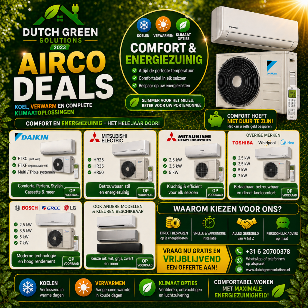 Bent u bijvoorbeeld op zoek naar professionele zonnepanelen installateurs, of wilt u een airco of laadpaal laten installeren? Bij Dutch Green Solutions staan we graag voor u klaar. Wilt u weten wij voor u kunnen betekenen, welke prijs daar mee gepaard gaat en wat u daarvoor krijgt? Wilt u een afspraak maken om de mogelijkheden te bespreken of heeft u nog vragen? Neem gerust contact met ons op. U kunt ons bellen op 085-2129265, daarnaast kunt u ons bereiken via WhatsApp, e-mail en het contactformulier. Spreken we u snel?